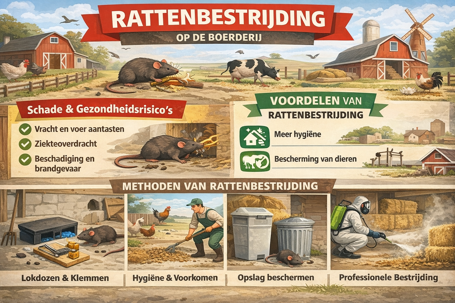 Ratten veroorzaken schade aan voer, gebouwen en installaties. Daarnaast vormen ze een risico voor de gezondheid van mens en dier. Tijdige en professionele bestrijding is essentieel.